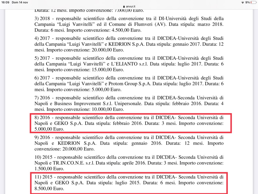 Con una delibera di giunta comunale del 14 gennaio 2020, grazie ad un’apposita convenzione, il Comune di Presenzano affida all’Università degli Studi della Campania per uno “Supporto tecnico-scientifico alla valutazione delle emissioni in atmosfera di una centrale termoelettrica a ciclo combinato”. Valutazione il cui esito era stato ovviamente positivo, ma con argomentazioni che mi avevano subito insospettito, poiché molto simili a quelle contenute nella documentazione progettuale dei proponenti (EDISON). Infatti l’ateneo (già Seconda Università degli Studi di Napoli – SUN) è legato dal 2014 con la Geko Spa (l’azienda che sta costruendo l’impianto a Presenzano) tramite la società partecipata Environmental Technologies srl (d’ora in poi ET). L’autore della relazione commissionata dal Comune di Presenzano, il prof. Dino Musmarra del Dipartimento di Ingegneria, è membro fondatore e vicepresidente della ET, nonché in passato (2015 e 2016) responsabile scientifico di convenzioni tra un dipartimento sempre della Seconda Università di Napoli e la Geko. Queste sono informazioni ufficiali contenute nei bilanci della Geko, dell’ateneo e nel curriculum vitae del prof. Musmarra. Si tratta, ripeto, di documentazione che è consultabile online, con un po’ di attenzione, determinazione ed amore per la verità.