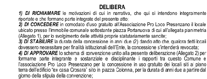 l’associazione Pro Loco Presenzano per la concessione in uso gratuito dei locali siti al piano terra dell’edificio “ex casa Crosara” sito in piazza Colonna, per la durata di anni due a partire dal