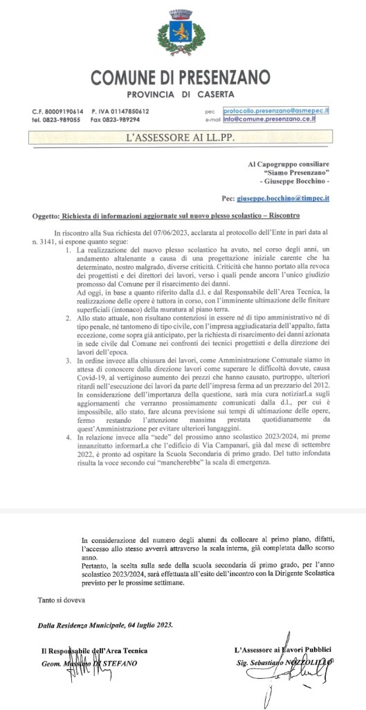 Le definiscono, in maniera impropria, “lungaggini”, e assicurano la massima attenzione quotidiana per evitare ulteriori ritardi (grazie, troppo buoni). Ma dieci anni non sono un “ritardo”, sono ingiustificabili tempi biblici e per questo fallimento, come ho detto in campagna elettorale, l’amministrazione uscente non meritava di essere riconfermata alla guida del Comune, perché ci si deve assumere la responsabilità della mancata soluzione di un problema, anche quando, eventualmente, non si è completamente colpevoli. Eppure, malgrado siano trascorsi due lustri dall’apertura del cantiere, l’attuale maggioranza, tramite l’assessore delegato ai Lavori pubblici, Sebastiano Nozzolillo, non è ancora in grado di dire ai cittadini di Presenzano, nemmeno in forma ipotetica, quando saranno ultimati i lavori di costruzione del nuovo plesso scolastico, opera pubblica ormai fuori termine. Per avere notizie più certe, bisogna ancora attendere le comunicazioni e gli aggiornamenti della direzione dei lavori… Forse perché c’è il rischio concreto che proprio l’aumento dei prezzi causato dal COVID 19 (la pandemia è scoppiata nel 2013?), di cui si parla nella nota di risposta alla mia richiesta di informazioni ufficiali, possa provocare il blocco definitivo per mancanza di risorse materiali da parte dell’impresa esecutrice. Come non sembrano esserci certezze nemmeno sull’utilizzo dell’edificio in via Campanari per ospitare la scuola secondaria di primo grado il prossimo anno scolastico, bisognerà attendere l’incontro con la dirigenza scolastica.
