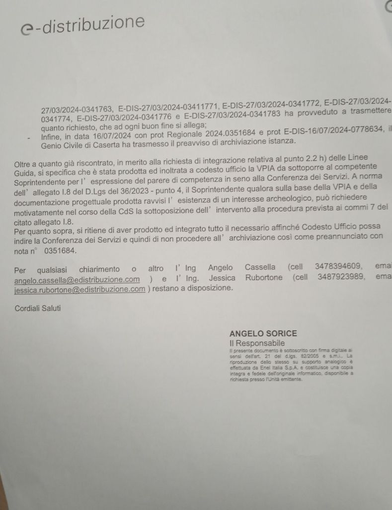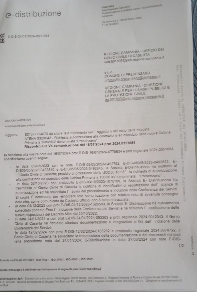 Si tratta di una serie di comunicazioni aziendali trasmesse al Genio Civile di Caserta a fine luglio di quest’anno, e inviate per conoscenza anche all’ufficio tecnico del Comune di Presenzano.