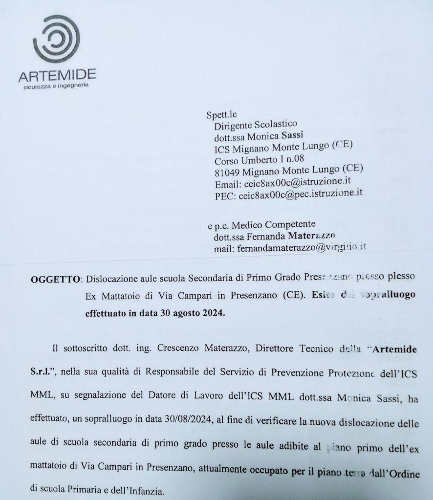 Anche se in maniera informale, avevo avuto già notizia di alcuni problemi segnalati al Comune direttamente dalla dirigenza scolastica di Mignano Monte Lungo per quanto riguarda il plesso scolastico in via Campanari. Problemi sia specifici della struttura che causati dalla presenza, nel terreno adiacente, del cantiere per la costruzione del centro polisportivo funzionale. Queste segnalazioni sono ufficiali e fanno parte di una relazione che contiene gli esiti del sopralluogo effettuato proprio su mandato della dirigente scolastica dell’ICS Mignano Monte Lungo, Monica Sassi. Il tecnico incaricato, Il dott. Crescenzo Materazzo, direttore della “Artemide S.r.l.”, ha rilevato, in particolare, due aspetti preoccupanti: una trave base muro sul lato posteriore della scuola che costituisce un rischio evidente per gli spazi esterni utilizzati dagli studenti, e l’inquinamento acustico generato dalle attività del cantiere , che interferisce, ovviamente in negativo, con le attività didattiche.