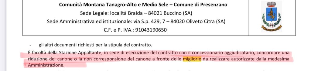 Per quanto riguarda il canone, in consiglio comunale, con i voti della maggioranza, era stata approvata la relazione dell’ufficio tecnico che prevedeva un canone concessorio minimo, posto a base di gara, pari ad € 3.000,00 all’anno. Non erano state previste dalla relazione, né discusse in assemblea, eventuali riduzioni, o addirittura il completo azzeramento del canone da parte del Comune per migliorie apportate alla struttura. A sorpresa, invece, questa possibilità è prevista dal disciplinare di gara, dove è scritto che “È facoltà della Stazione Appaltante, in sede di esecuzione del contratto con il concessionario aggiudicatario, concordare una riduzione del canone o la non corresponsione del canone a fronte delle migliorie da realizzare autorizzate dalla medesima Amministrazione”.
