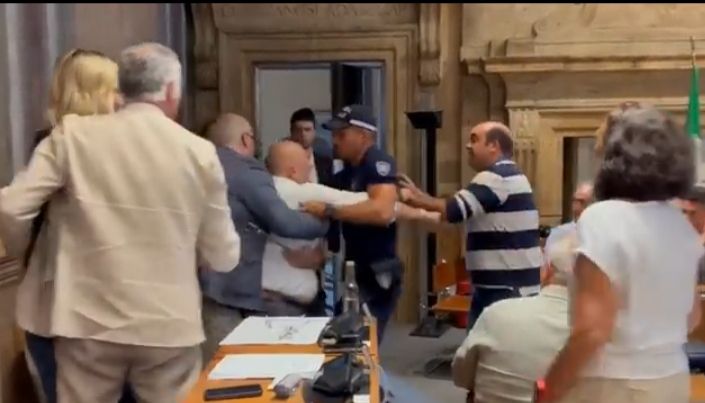 E, mentre alcuni consiglieri di maggioranza cercavano di allontanarlo trascinandolo verso l’uscita dell’aula, il sindaco — sempre gridando — si è rivolto all’assessore ai Lavori pubblici Nozzolillo, dicendogli: