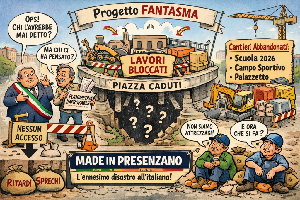 A Presenzano ogni lavoro pubblico finisce per essere una telenovela: dalle modifiche in corso d’opera non autorizzate dall’ufficio tecnico (Via Vadopiano e nuovi loculi cimiteriali), ai cantieri bloccati da mesi (Campo sportivo e Palazzetto in via Campanari), forse perché le ditte incaricate non hanno le risorse umane ed economiche per proseguire, addirittura qualche impresa avrebbe accumulato debiti con i fornitori per l’acquisto dei materiali necessari (pietrame campo sportivo). Ovviamente senza dimenticare il caso più emblematico, la fabbrica di San Pietro, ossia il “nuovo” plesso scolastico (caro assessore, gentile sindaco, sta passando anche il mese di gennaio 2026…) Ma adesso abbiamo un altro caso, forse ancora più clamoroso dei precedenti: un’opera pubblica che sulla carta esiste, ma che nella realtà non può nemmeno iniziare perché sarebbe priva degli elementi minimi di cantierabilità. Sto parlando dei lavori di riqualificazione e consolidamento di Piazza ai Caduti. Questi lavori non possono partire perché, circostanza davvero singolare, la progettazione non avrebbe previsto né le modalità di accesso all’area sottostante, né lo spazio necessario all’allestimento dell’area di cantiere. Forse i professionisti incaricati pensavano di poter rafforzare i pilastri della piazza con i tappeti volanti…